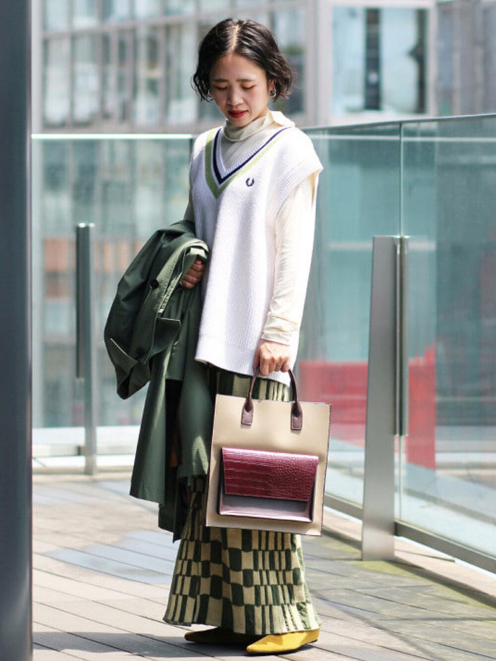 <FRED PERRY>の別注ベスト♡ トレンドのグリーン系でスタイリング。 普遍的な<FRED PERRY>のアイテムたちは飽きがこず、なが〜く着ていただけます!