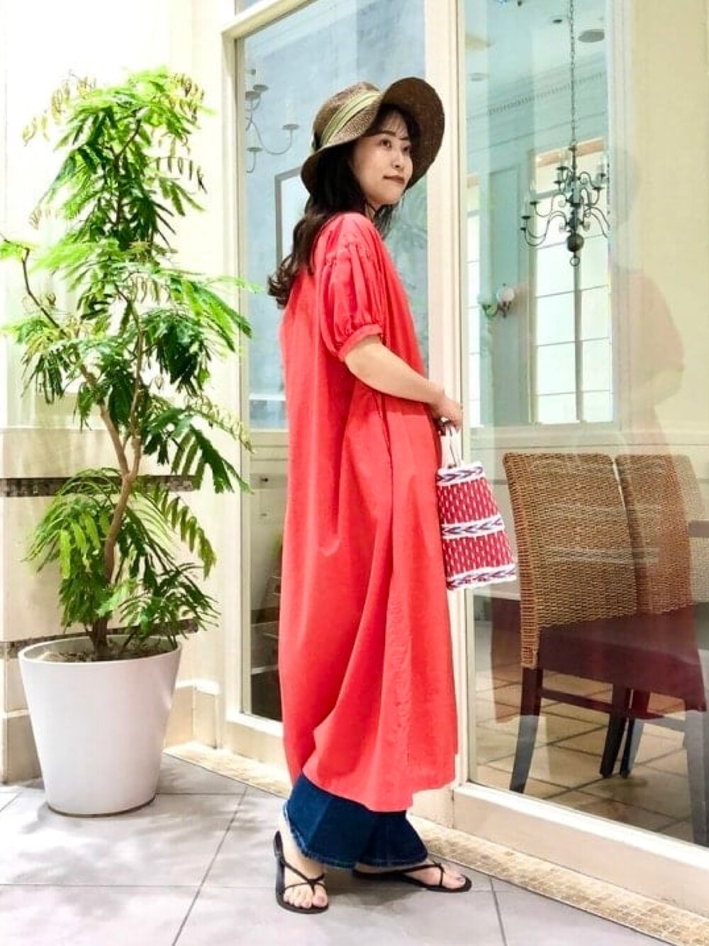 【暑さに負けないカラー!!】 目を惹くこちらのワンピース、SALEでお求めやすくなっております☺︎ 今日はデニムとラフに合わせました。