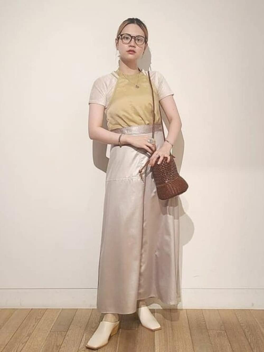 今回は同色系コーデにしてみました。中でもポイントは素材感!素材感を変えることでより同色系コーデをより楽しんでいただけます。ベロアやサテン、チンツ素材は光の加減で雰囲気が変わるので着ていても気分が上がります♪サテンキャミソールは一見着こなすのが難しそうですが、Tシャツにレイヤードすると簡単にこなれ感がでますよー!