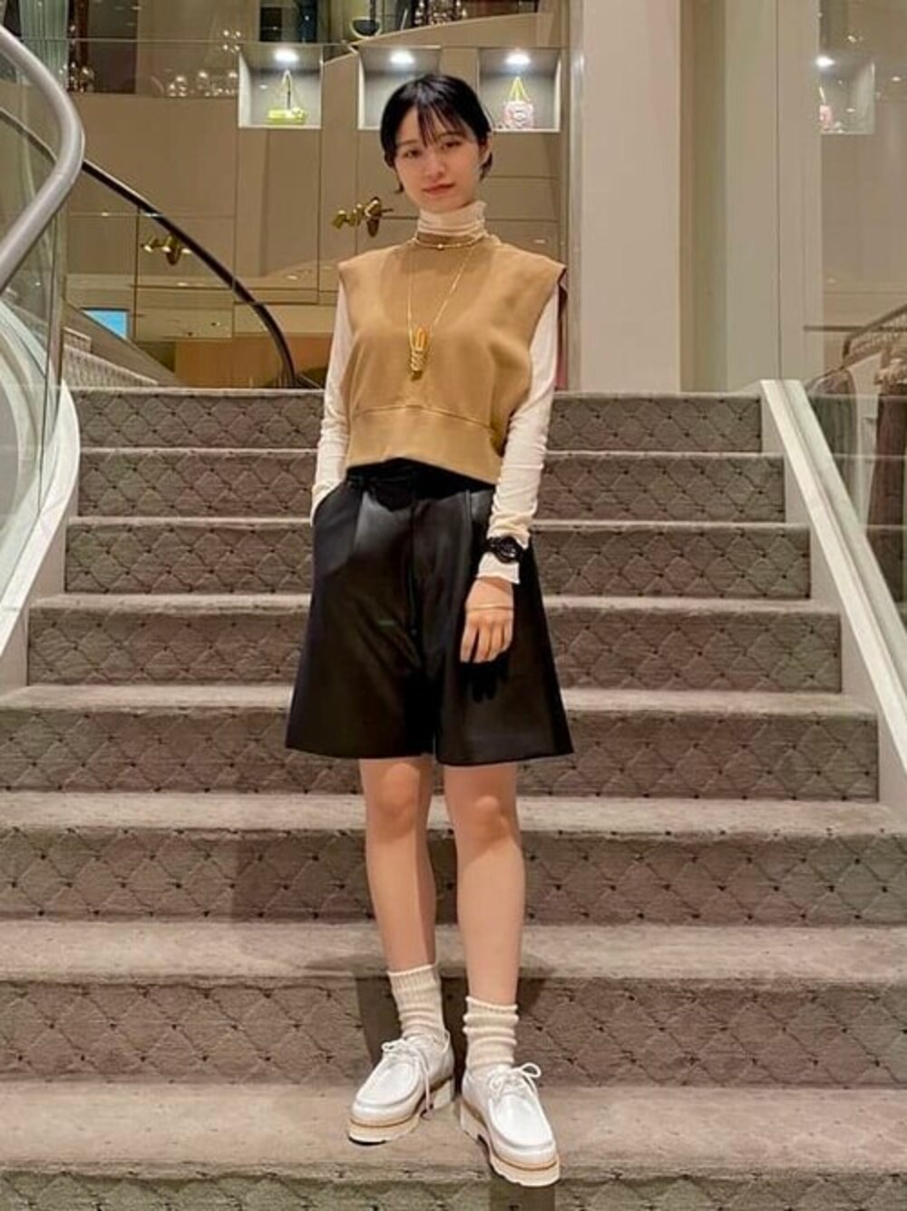 ストレッチが効いたタートルネックは、使い勝手抜群です。ノースリーブのスウェットとレイヤードしました。ゴールドのアクセサリーを重ねつけして顔まわりを華やかに。柔らかな質感に反して、フェイクレザーショーツでメリハリをつけました。<paraboot>×<Ray BEAMS>のミカエルは盛れるのでおすすめです。