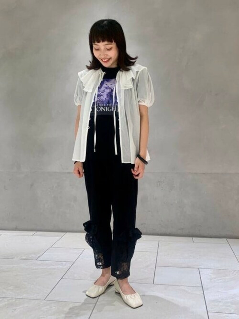 入荷したての<MIYAO>のパンツを主役にスタイリングを組みました。レースがついていて、とても可愛らしい!のでそれに合わせてフリルカラーのブラウスを羽織りました◎ そこまで色味を出さずにモノトーンで合わせたのも気に入っています!!