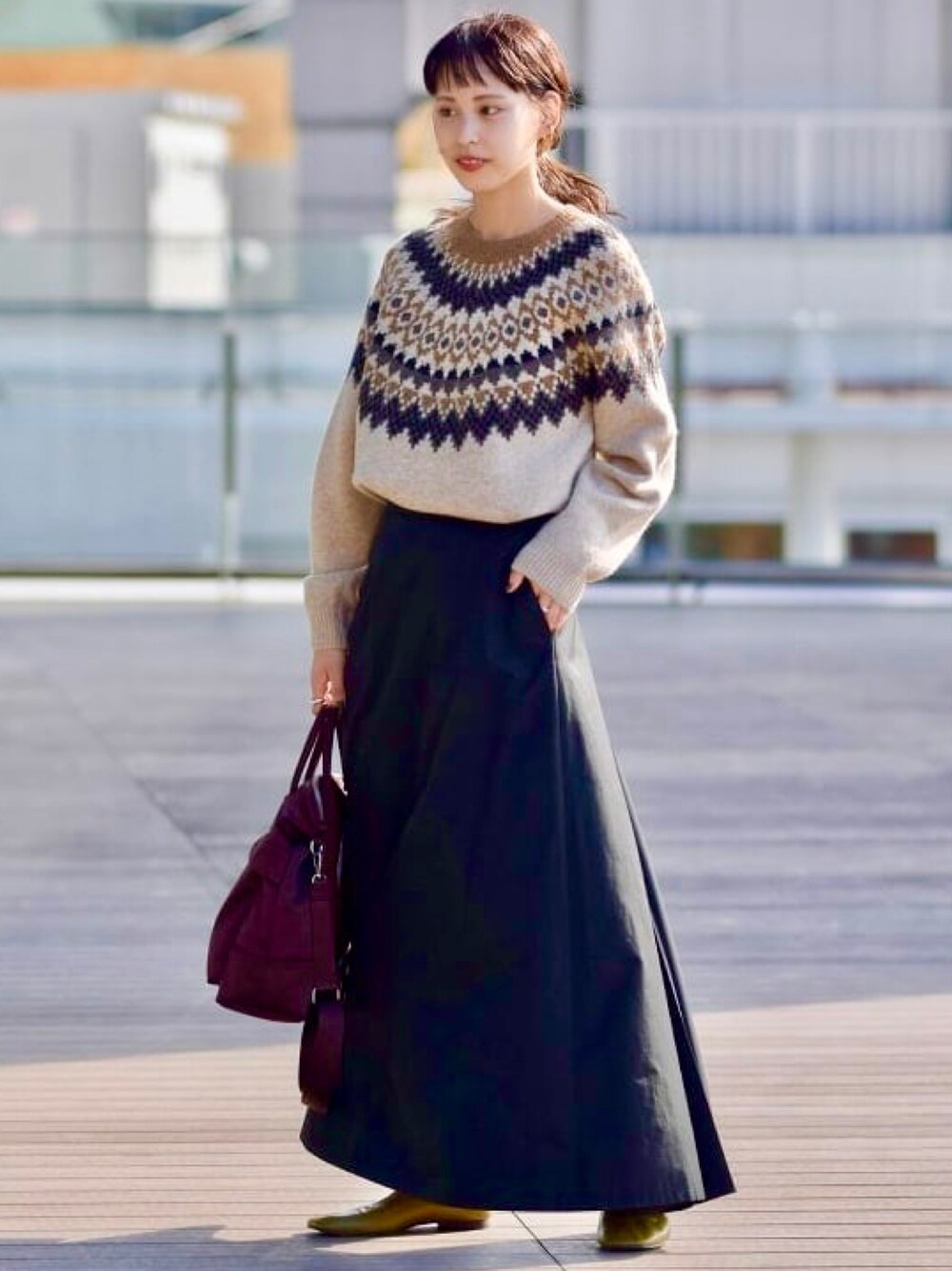 “おすすめスカート”バッグスタイルが特徴です! ノルディック柄ニットは定番ですが古着でみかけるものよりも、ふっくらふわっとな素材感が魅力的です。 綺麗なスカートと合わせても浮かないのが嬉しいポイント◎あとはヘルメットバッグ、こちらは両色気になります◎通勤バッグにとってもいいサイズ!
