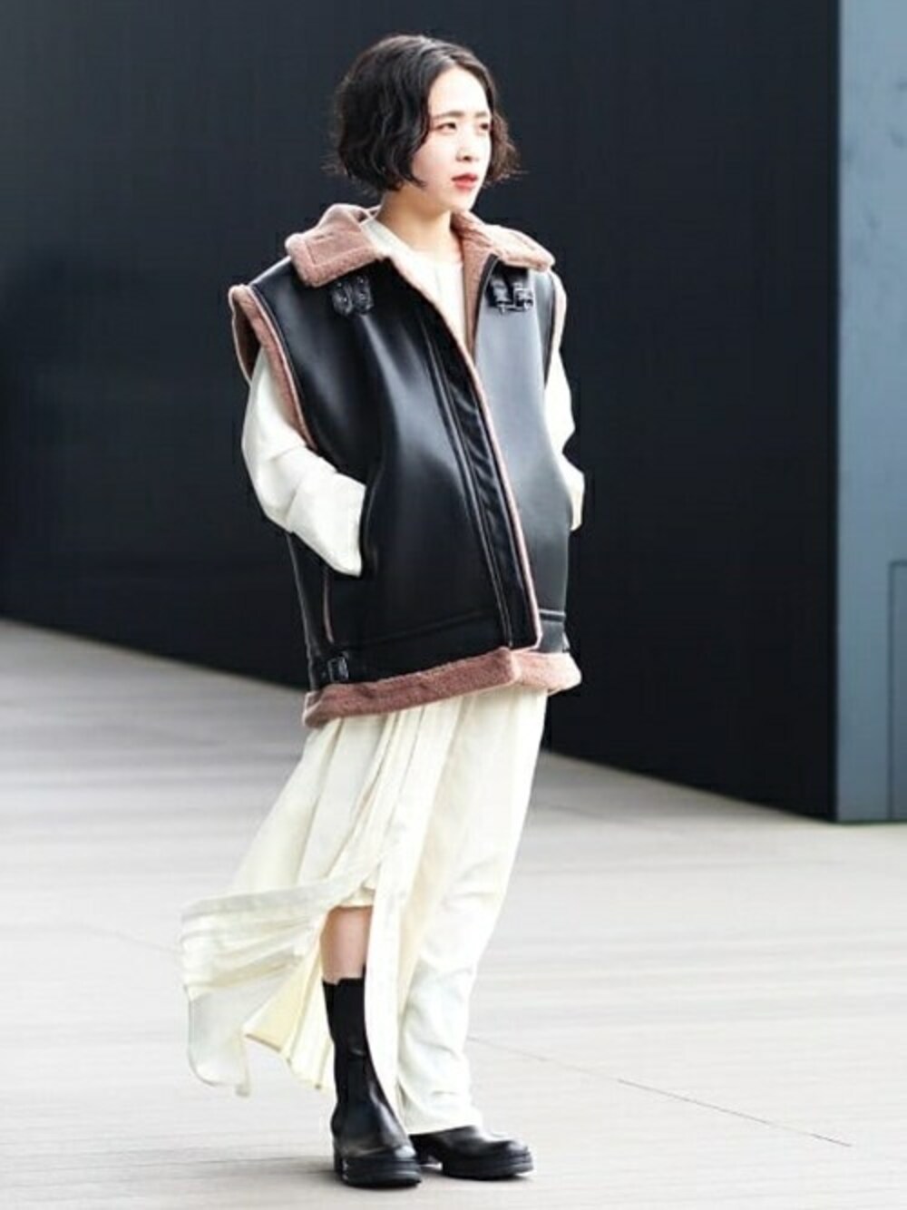 黒のレザーでちょっとハードなアイテムの時は、女性らしい少し甘めのワンピースでバランスをとります。