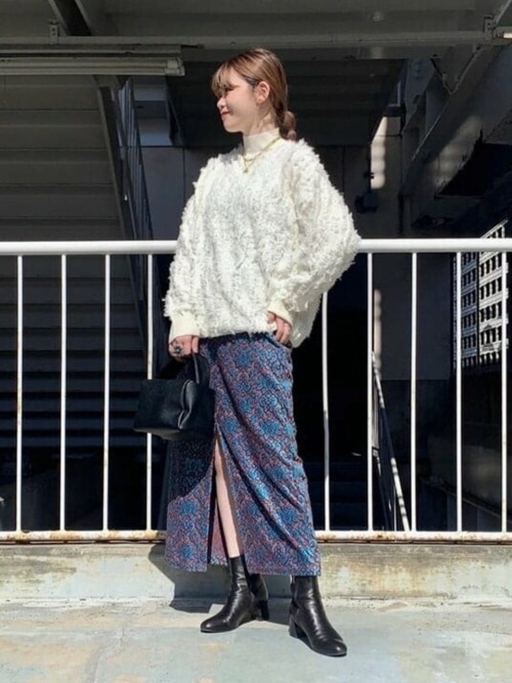 最近は少し大人っぽいスタイルが多いです。きっと、もうお馴染み、このお気に入りのスカートとブーツを履く事が多いからでしょう♡ちなみにトップスに合わせたニットは前面にフリンジが付いた一枚でも様になるおしゃれアイテム!!!