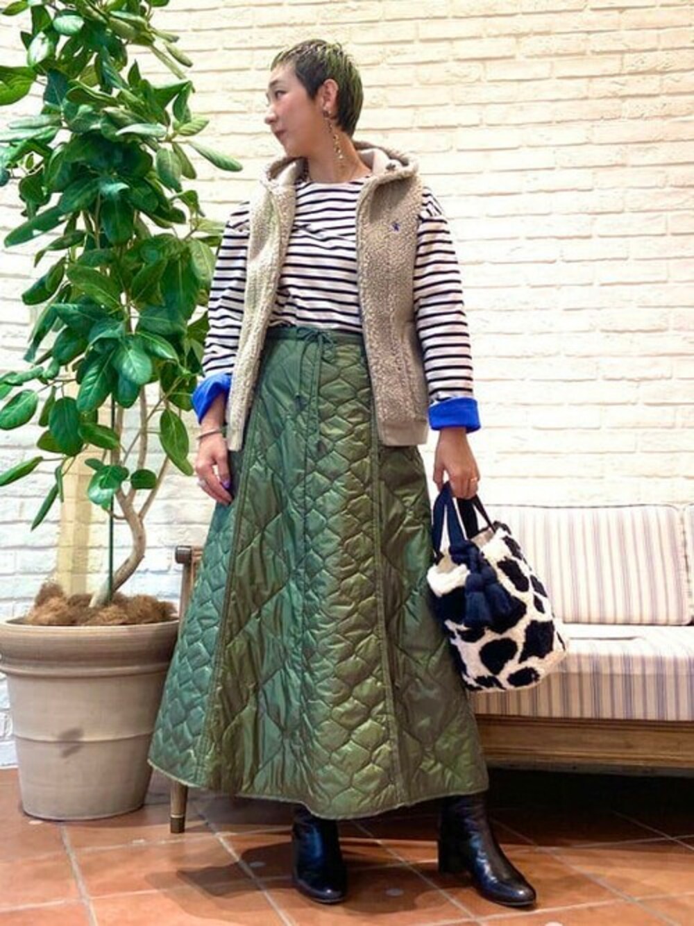 今日のテーマは寒くなっても公園遊びができる、完全防備のママコーデです(笑) 〈ORCIVAL〉のバスクシャツはまさかの裏地がフリース仕様。 その上に〈GYMPHILEX〉のボアベストを着れば寒くなるわけがない!!です!! トドメはボトムスの〈BEAMS BOY〉サーモライトのキルティングスカート。 スカートですが足がホカホカに暖かいです。 下にレギンスなど履いていただくのも良いかと思います♪ 私は多分スカートを買っちゃう気がします…(笑)