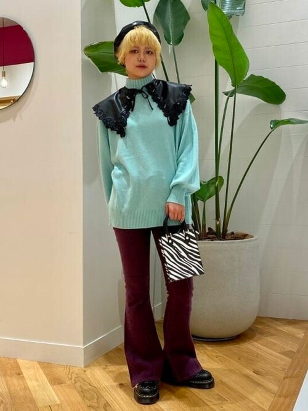 【目を引く冬のカラーコーデ】明るい青ニットに暗めの紫デニムを合わせました!小物は黒でまとめるのがオススメです!ニットは軽くて凄く着やすいです。デニムはフレアの形が可愛すぎます!!