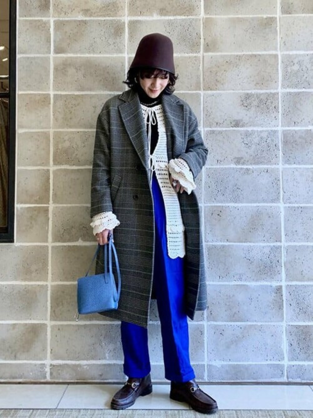 【アウターフェア開催!】《秋冬でもカラーで攻める!》最近愛用中の帽子にチェックチェスターコートを合わせてクラシカルにしてみましたが、秋冬でもカラーリングを楽しみたい!そんな気分でブルーのパンツやバッグを合わせてコーディネートしてみました!