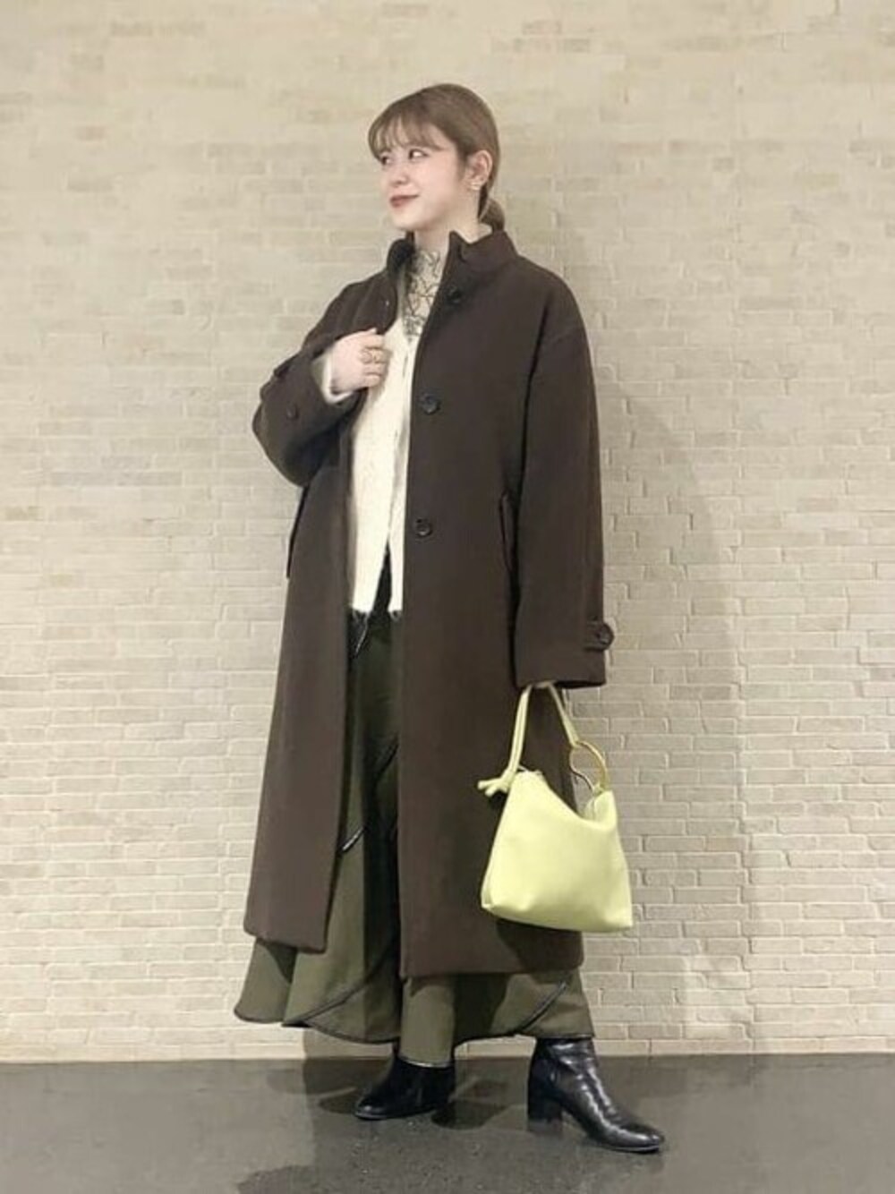 【こちらのアウター今だけ10%オフ💛】私一推しのコートはこちら!スタンドカラーのロングコートです!大人っぽくこっくり色のお洋服で合わせました☺︎