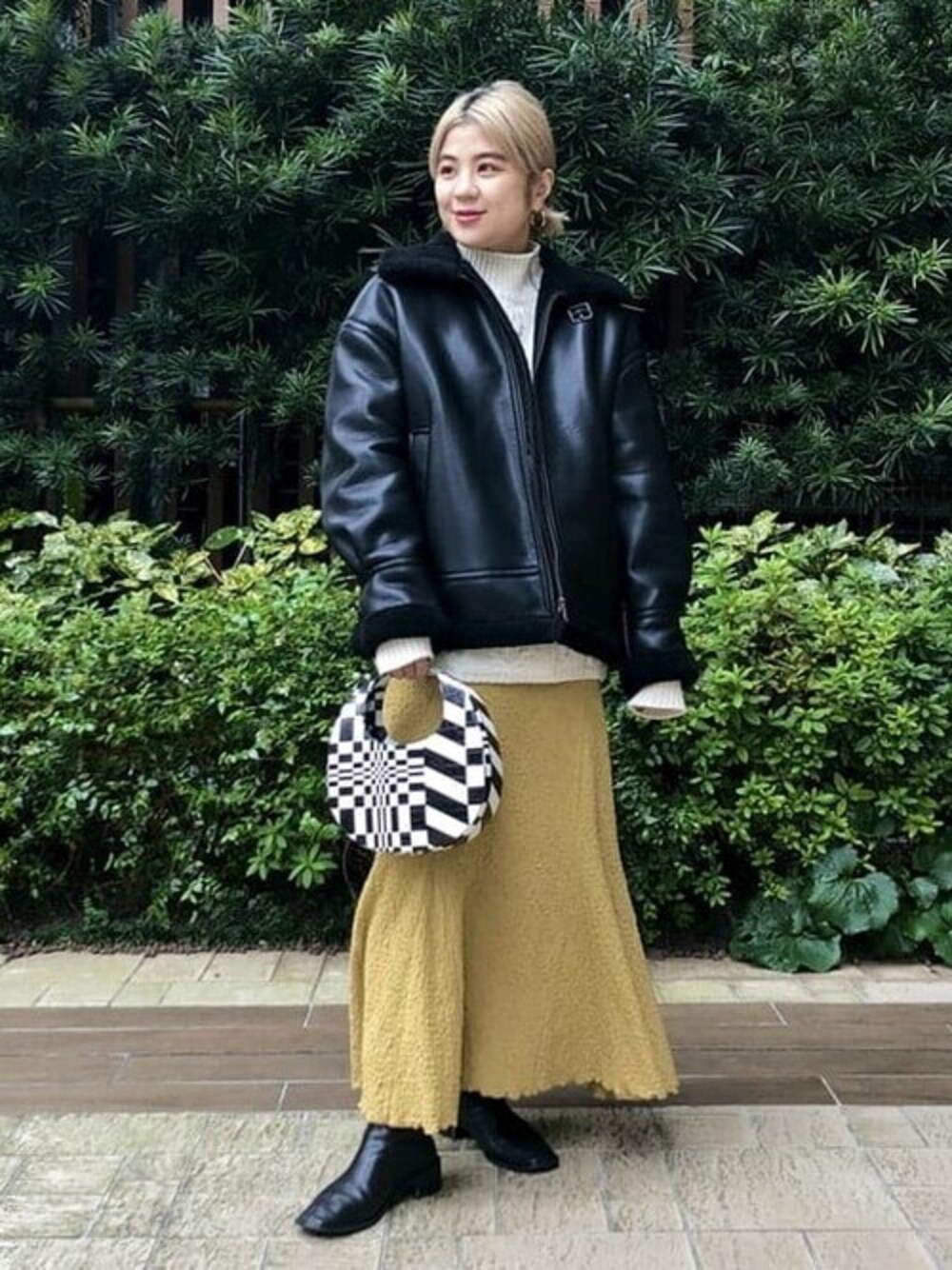 【ブラックをポイントに◎】スタイリングが女性らしくなりすぎてしまった!なんて日はアウターと小物で差をつけちゃいましょう◎本日のミヤザワはアウター、バッグ、ブーツをブラックでまとめました! アウターを脱いだ時とのギャップも楽しめちゃいますね!