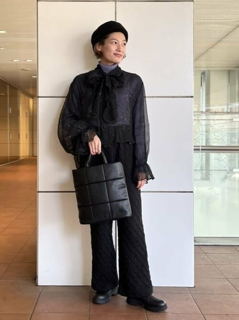 <sister jane>のキラキラブラウスをメインにブラックでまとめたコーディネートにしました!私普段黒はあまり着ないので、新鮮です♪(笑)胸元よーく見るとリボンになってるんです!
