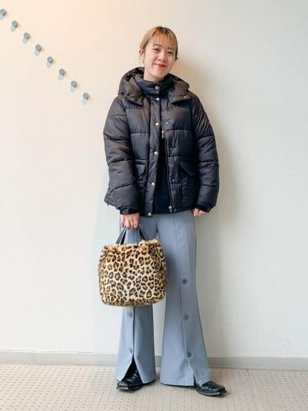 一番上のボタンを閉めると首もしっかり暖かいです!【THE NORTH FACE】のダウンは、軽くてストリートな雰囲気に!レオパードのバッグがコーディネートの差し柄です◎