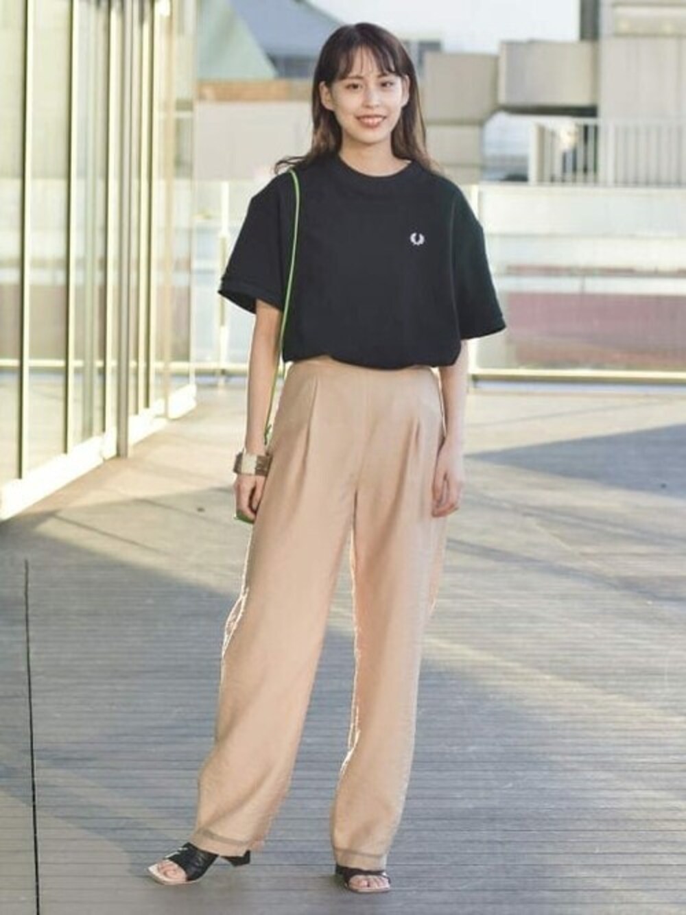 【FRED PERRY】×【Ray BEAMS】オススメ第三弾です◎サイズはざっくり大きめ、鹿の子素材、クルーネック、のTシャツはメンズライクでいいですよね。オーガンジー素材のパンツを合わせると少しだけフェミニンな印象になり落ち着きます◎