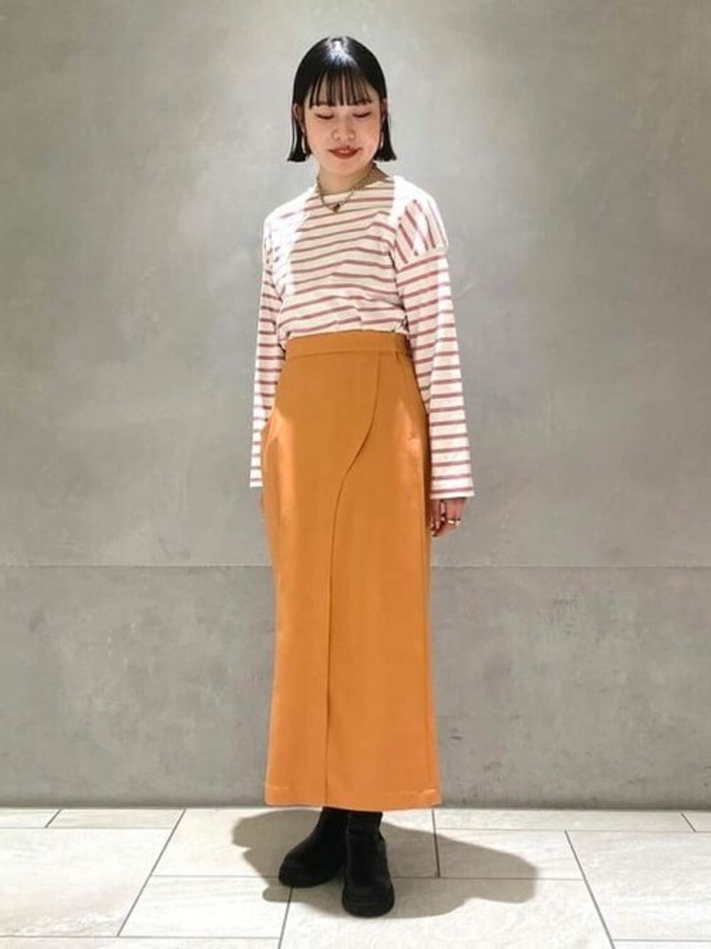 【春先取りコーディネート♡】春らしいカラーアイテムで、気分の上がるコーディネートにしてみました。 スカートはラップスカートのように、カーブステッチが入っているのがポイントです。 ウエストインしても、今時期ならニットを被せて着るのもかわいいですよ◎