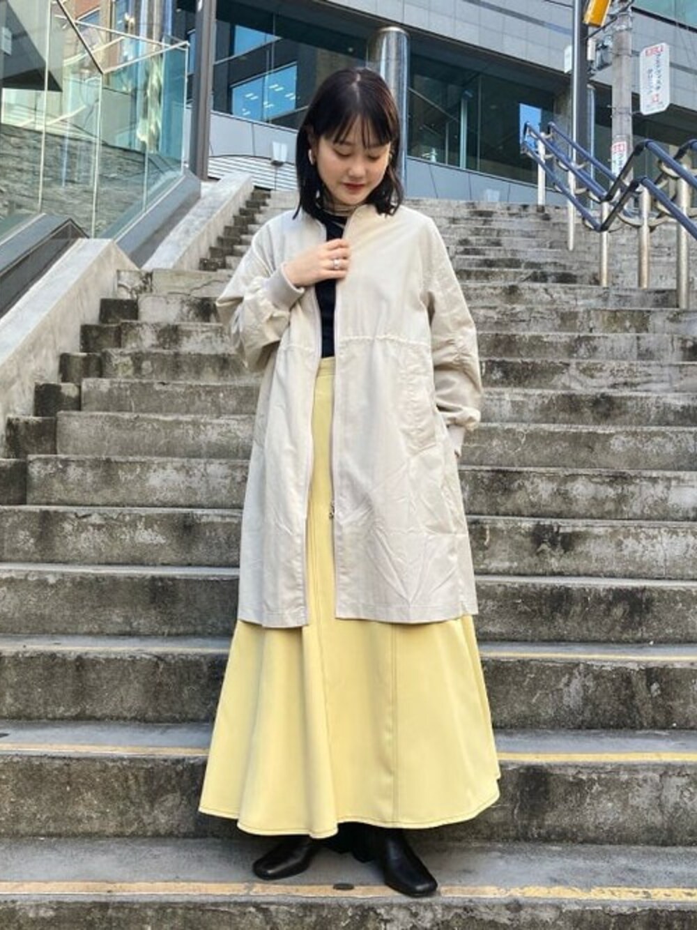 後ろのプリーツが可愛らしいアウターをメインに最近入荷した春カラーのスカートと綺麗めコーディネートです〜♪