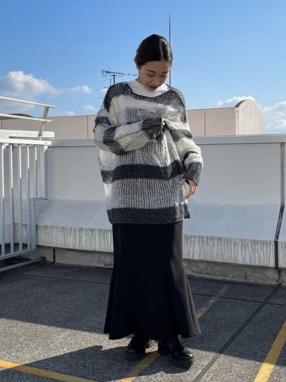 <VAPORIZE>のニットを着用! 秋冬にこのニットのブラックを購入したのですが、着回し抜群でとても気に入ってます◎Ray BEAMSのマーメイドスカートに合わせて、女性らしく合わせてみました!