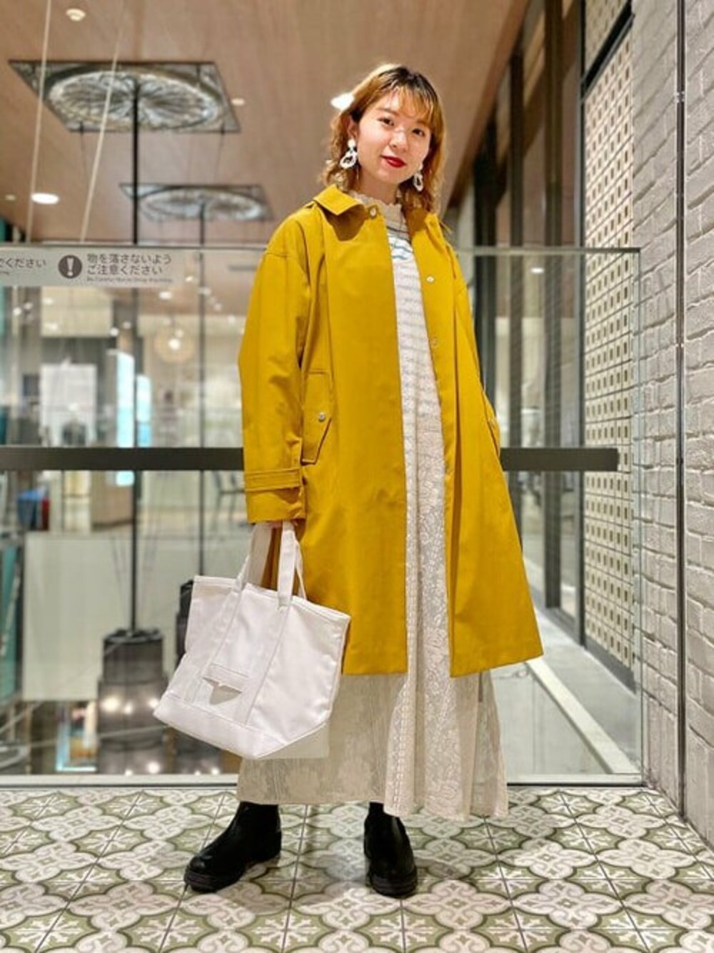 暖かい時期が待ち遠しくなる華やかカラーのコートを主役に♪162cm、サイズ1を着用してます。マスタードカラーはパキッとし過ぎず、肌馴染みが良いカラーなのでお勧め。程よくハリがあり、軽いので着心地も◎フードを外すとよりシンプルなステンカラーコートに変身します!インナーも、透け感が可愛いワンピースとデニムを合わせて、春全開なコーディネートにしました♪