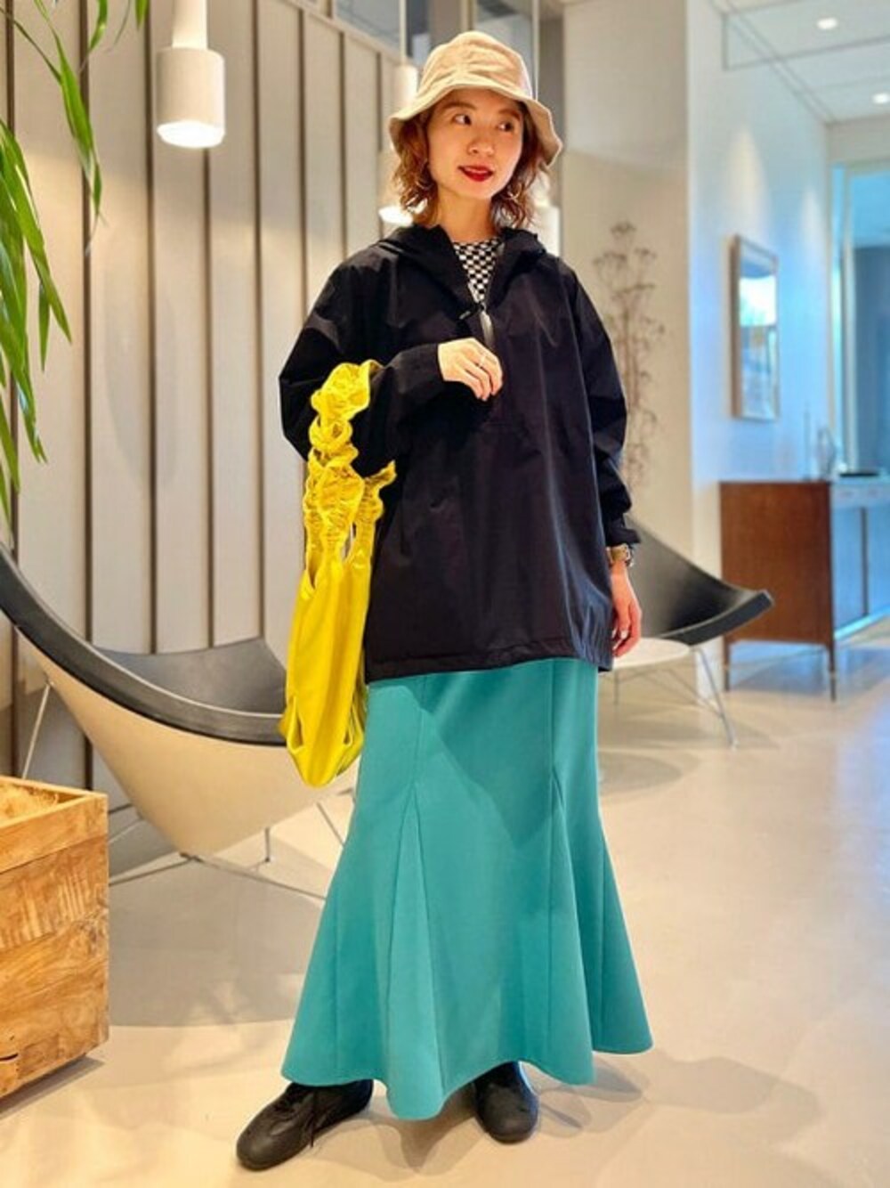 アウトドア×ガーリー!<Marmot(マーモット)>別注のアノラックを女性らしいマーメイドスカートと合わせて都会的なスタイリングにしました♪オーバーサイズながらも、ストンと落ちるシルエットなので、ボトムスを選びません◎ パッカブル仕様で撥水性にも優れているので、急な雨の日でも安心です〜!