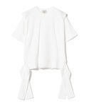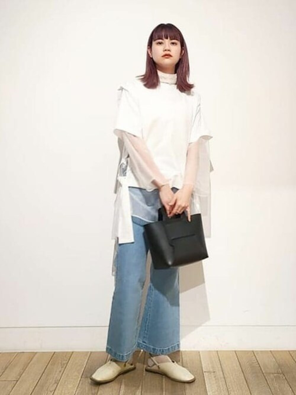 <FUMIE=TANAKA>×<Ray BEAMS>のスペシャルアイテムのお取扱いがスタートしております!私はサイドのリボンが可愛いTシャツと、チュールのブラウスをレイヤードして着てみました。ドレッシーになりがちなブラウスですが、デニムやTシャツとレイヤードすることで普段使いしやすくなります◎