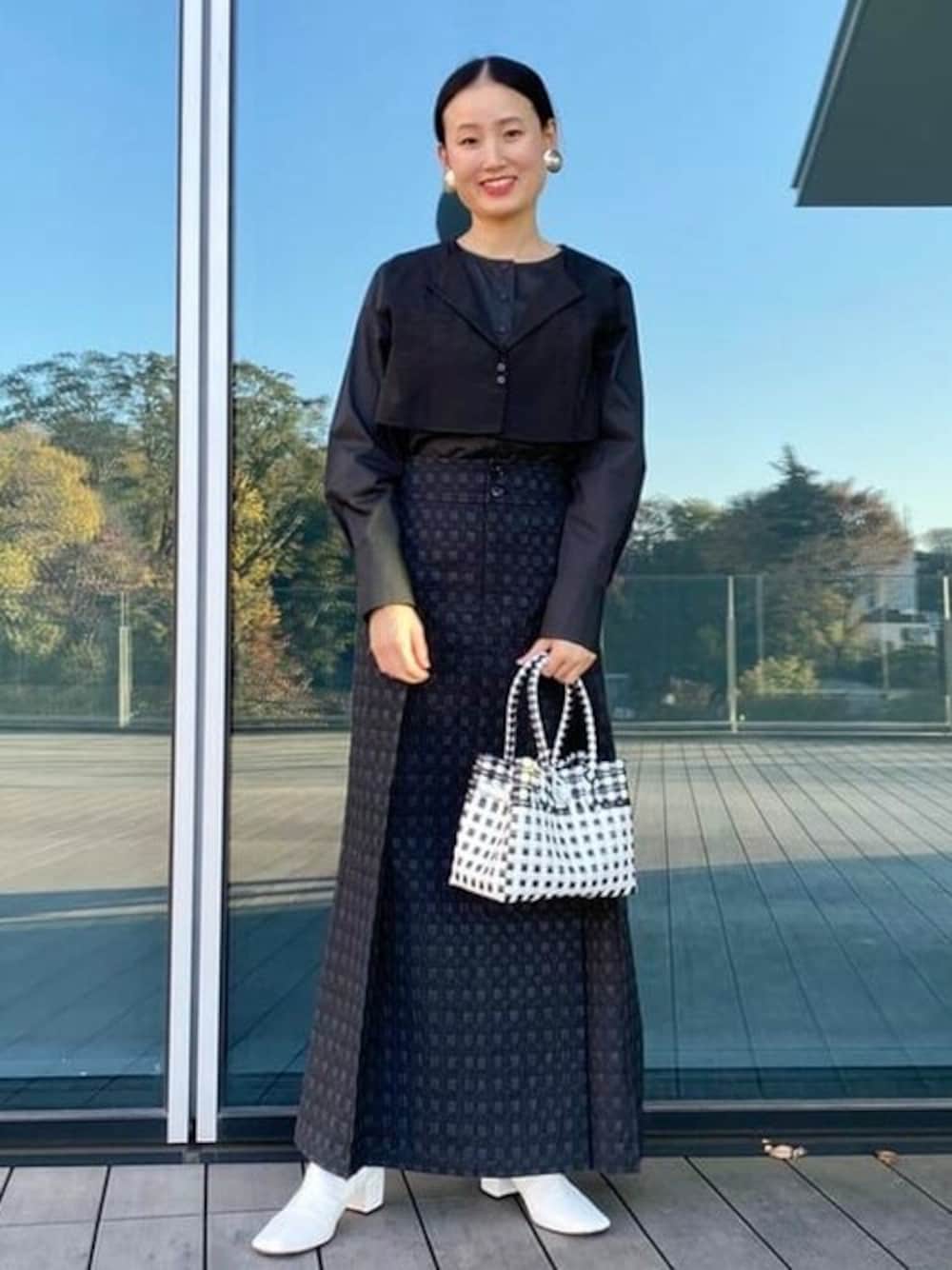 【予約受付中♡】モノトーンでまとめました!レイヤードデザインのブラウスや、サッカー生地のチェック柄スカートで、ブラックコーデの中にも変化を持たせ、洗練された印象に仕上げました。 ビームス 新丸の内 / たて ふくみ