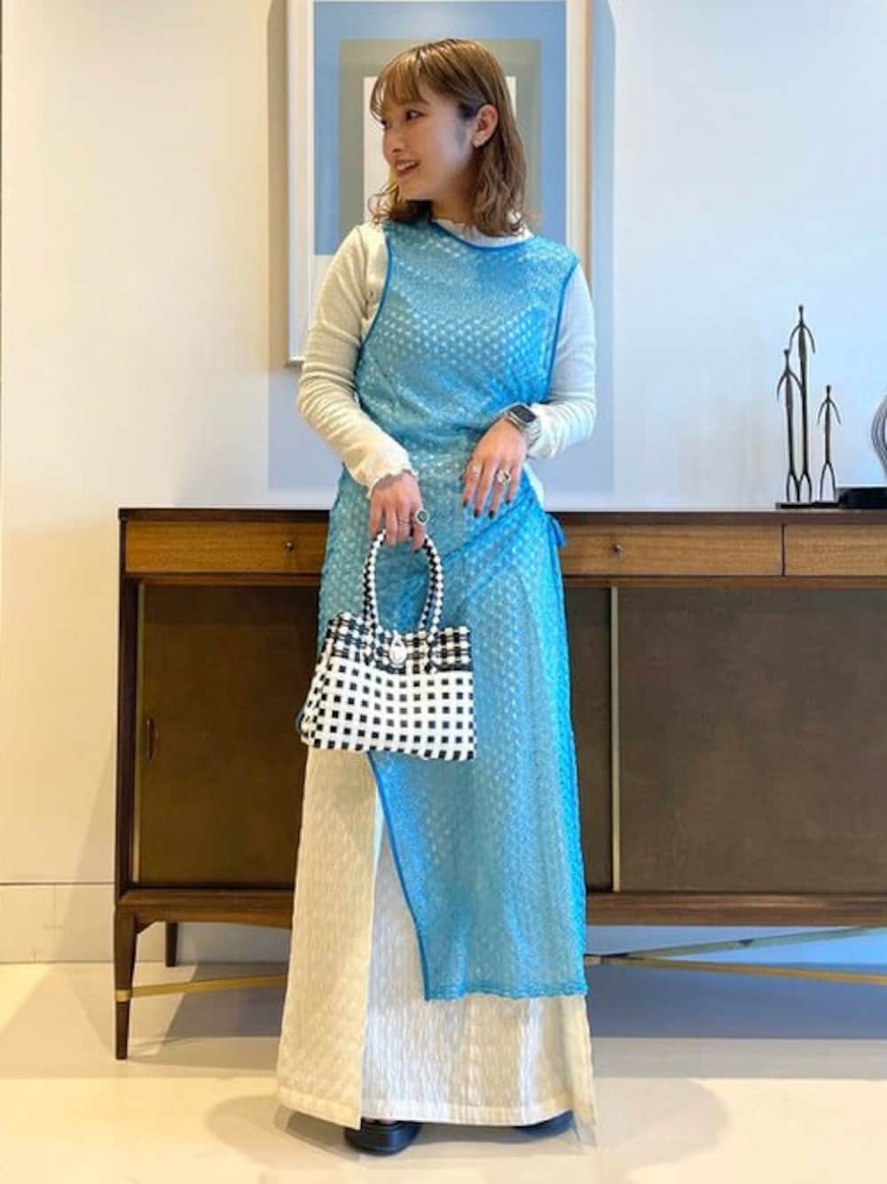 【レースワンピース】これ1枚着るだけで、おしゃれ上級者に見えるレースワンピース♡まだ寒いので長袖と合わせてます。ホワイト×ブルーで爽やかにしました。ブルーはシルバーアクセサリーとの相性もGOOD!! ビームス 二子玉川 / 松本 佳菜子
