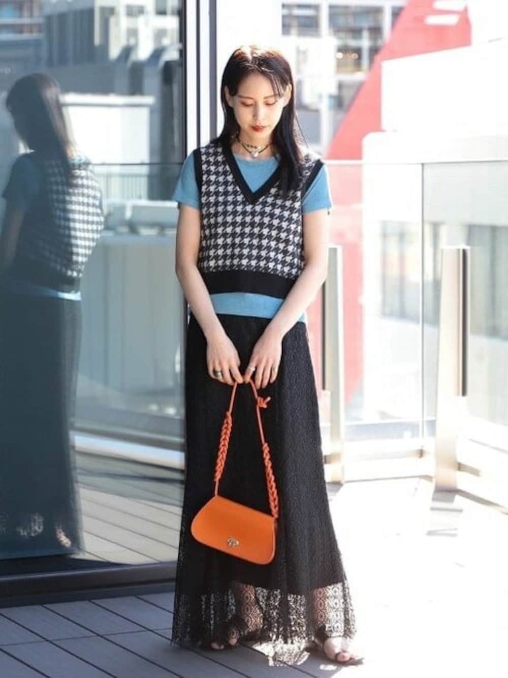 コンパクトなベストにはコンパクトTがオススメです!ブラック×ブルーは大好きでついつい合わせてしまうので、バッグでオレンジを追加してみました! ビームス ジャパン / Aoi