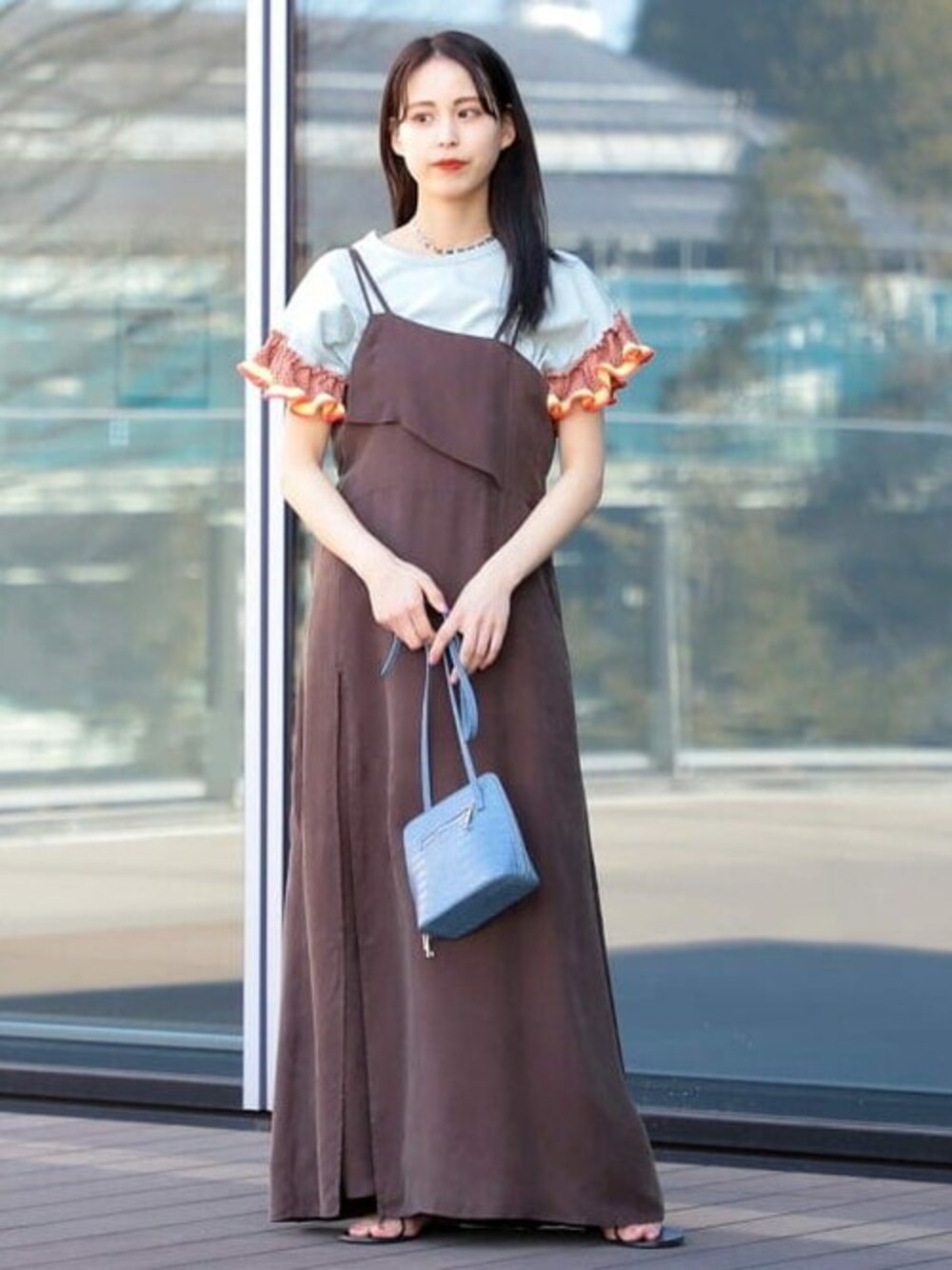 大人気のフリルTシャツはミントが特にイチオシです♪ブラウンのワンピースと合わせてチョコミントカラーにコーディネート。ワンピースのバッグデザインもお気に入りです。 ビームスジャパン 新宿 / Aoi