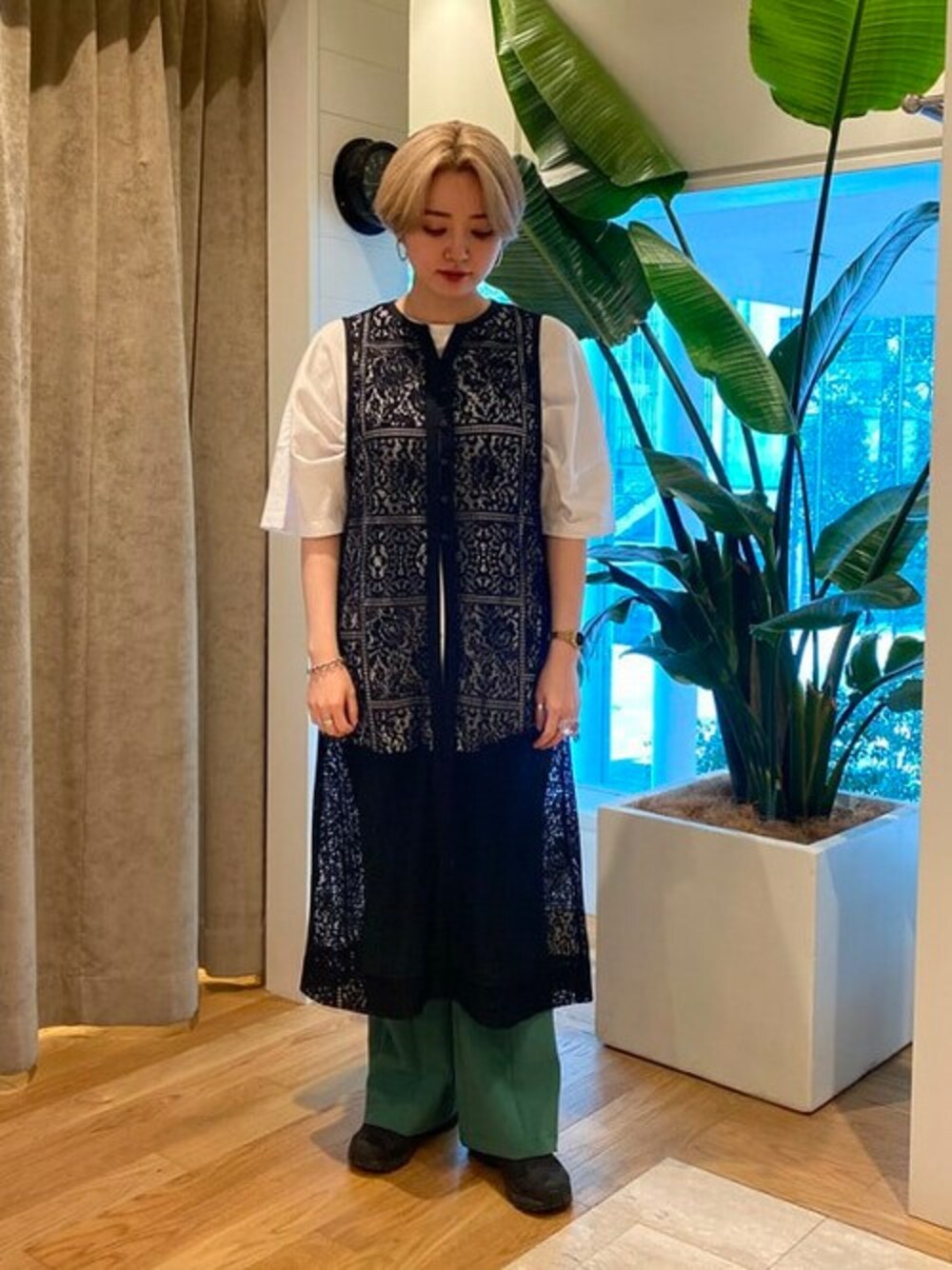レースジレはレイヤードに大活躍します。レースのアイテムをプラスするだけで女性らしいコーディネートになりますね。 ビームス 二子玉川 / モナ