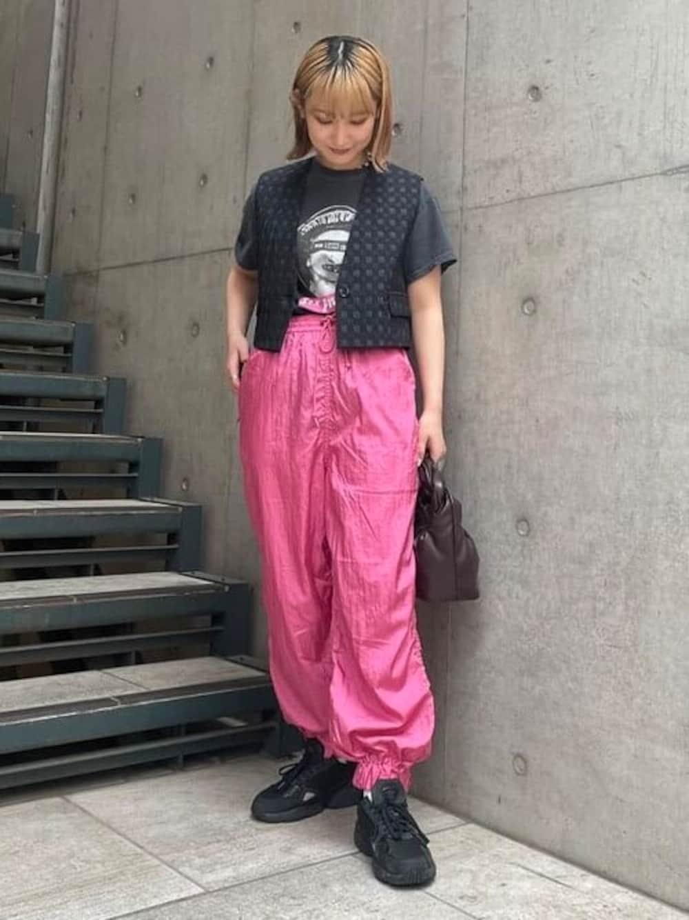 【チェッカーピンクコーデ】今年のトレンド、チェッカー柄を取り入れたコーディネートです♡プリントTシャツのピンクと、パンツの色をリンクさせてます♡Tシャツとレイヤードしているインナーとベストがさりげなくチェッカー柄です!(C)2022 Sex Pistols Residuals ビームス 二子玉川 / 松本 佳菜子
