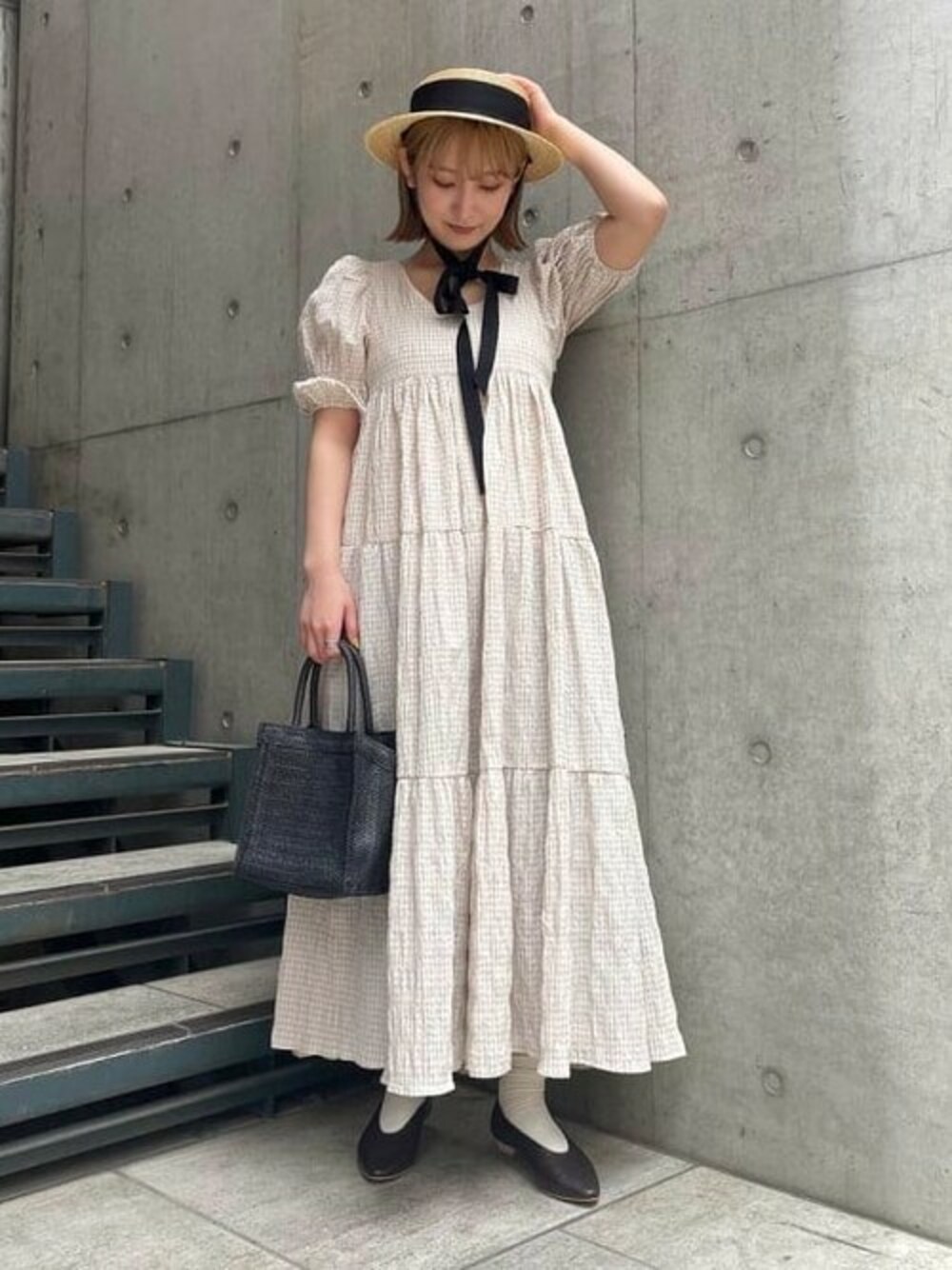 【春夏お出かけスタイル】とっても可愛いワンピ入荷しました!♡淡いベージュのワンピースに麦わら帽子を合わせて、女性らしさ全開の松本です。ワンピースの後ろデザインも可愛すぎる♡シューズや、バックは帽子のリボンに合わせて黒っぽい色でまとめてます。 ビームス 二子玉川 / 松本 佳菜子