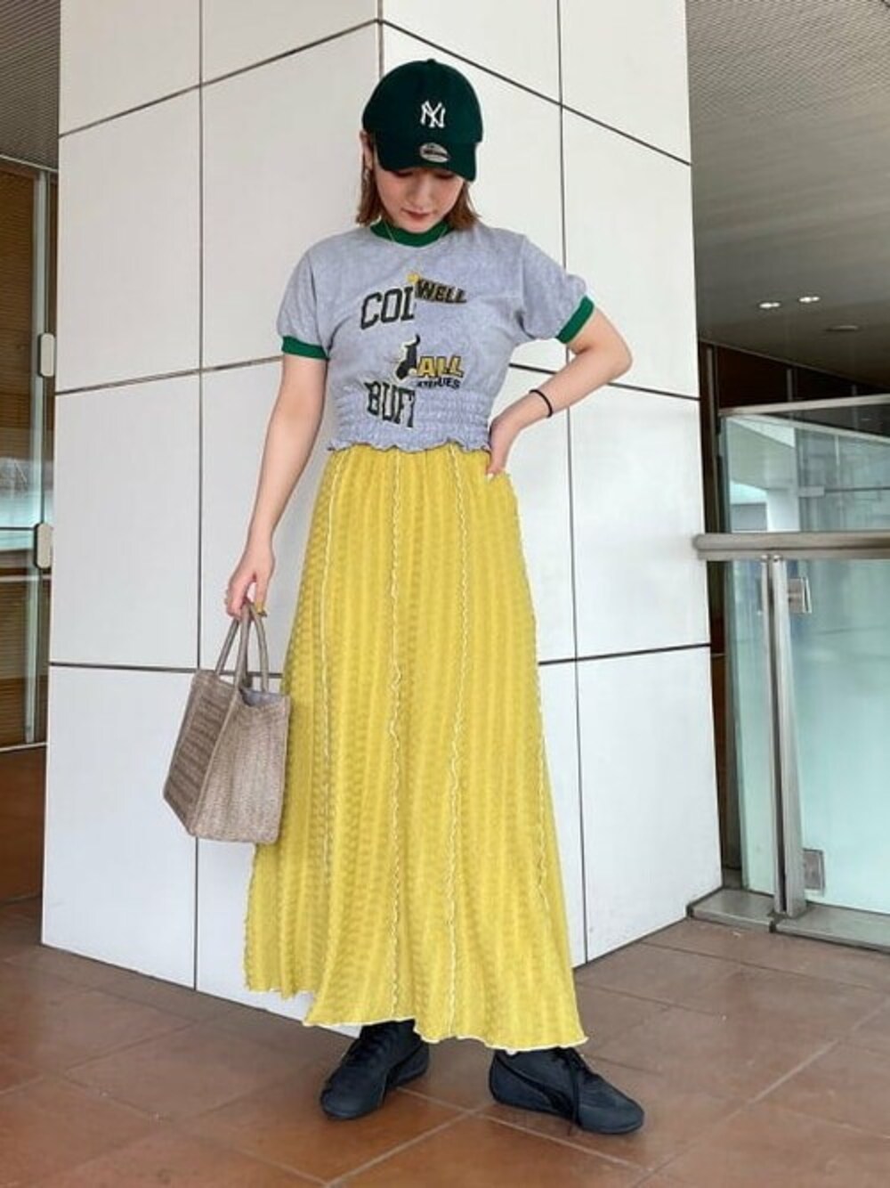 【松本の休日】松本の休日スタイルです。77circaのTシャツの色を拾って、スカートや帽子を合わせました。奇跡的にネイルの色もいい感じにマッチしました♪スカートはウェストがゴムなのでとっても便利!たくさん食べても大丈夫ですね♪どんなスタイルにも合うヤンキースキャップは松本の必需品です! ビームス 二子玉川 / 松山 佳菜子
