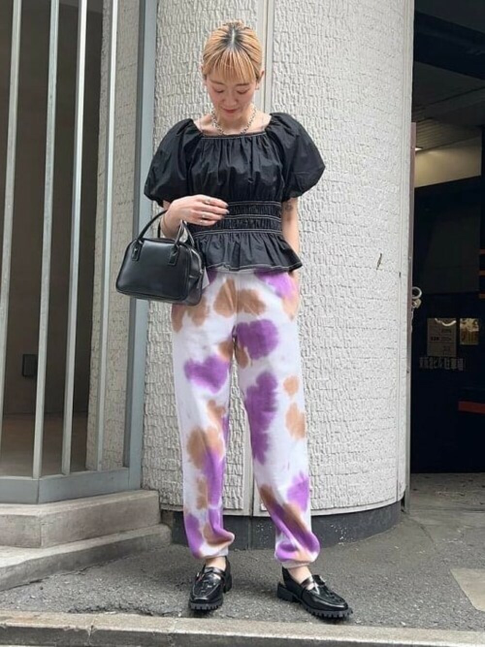 【個性派スウェットこう着る】鮮やかなタイダイスウェットパンツをメインにブラックアイテムを合わせて、レディライクに仕上げました♡ブラウスの袖やキュッとしたウエストがメリハリつけくれます!《♡+》で保存、フォローで気軽に見返すことができます♪Instagramも是非Followして下さいっ!〔商品ページより、試着申し込みが可能です。お気軽にお申し込みください◎〕 ビームス ストリート 梅田 / コウノ ミユ