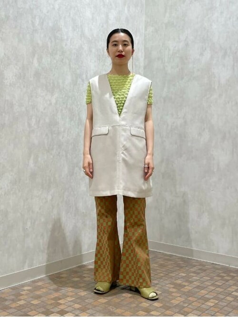 新作のパンツ、ややフレアなシルエットが美しくて好評です。(写真ではうっかりサイズ1を履いてしまっております、サイズ0ならもう少しすっきり着れますよ。)アイボリーのベストを合わせてちょっとキレイな印象にしてみました。 ビームス 池袋 / kawa-kami