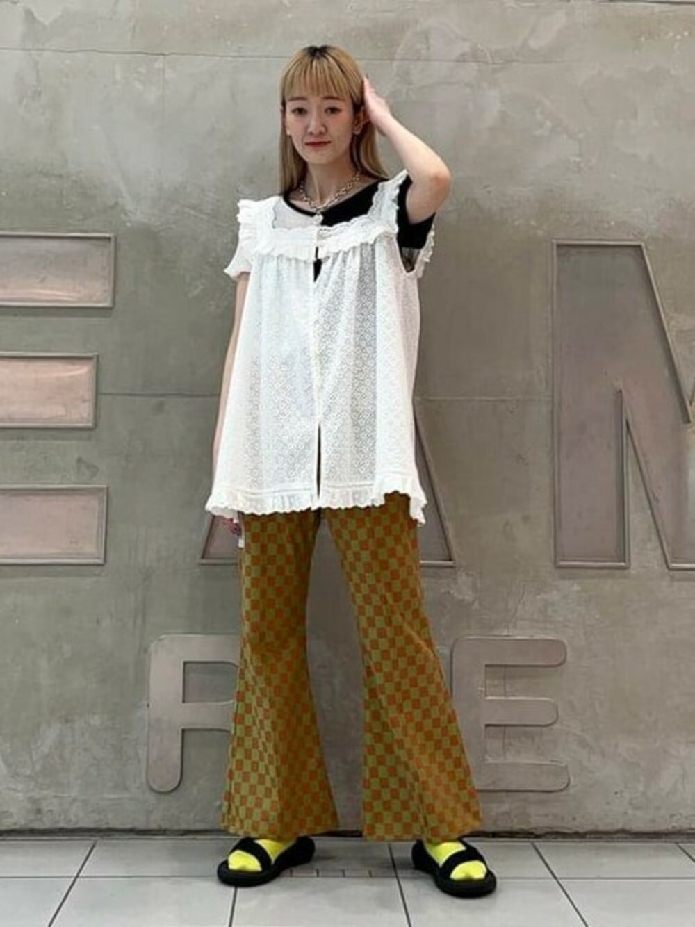 柔らかいレースと珍しいカラーのチェッカー柄パンツが可愛い♡そして美シルエットなのです!たまには女の子らしいものを身につけたいですね〜♪ ビームス ストリート 梅田 / コウノ ミユ