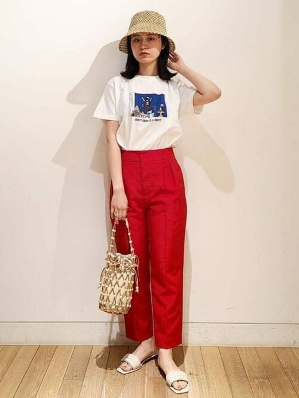 キャッチーなイラストTシャツに、ビビットなカラーパンツを。幼くなりがちなTシャツもシルエットの綺麗なパンツ、レザーサンダルと合わせることで大人カジュアルに着こなせます。小物はオフホワイトで統一して夏らしくスッキリとしたスタイリングにしました。 ビームス 町田 / 平居(このみまる)