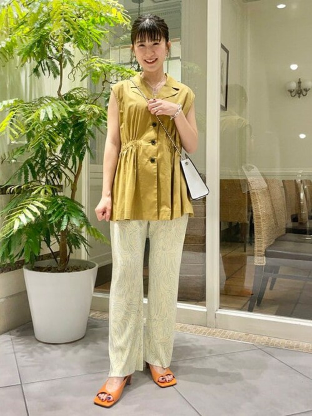新規のブラウスはフレンチスリーブで二の腕も全部出ないのでノースリーブが苦手な方も着用しやすいです♪ボタンを開けて羽織りにも出来るのでTシャツと重ねても可愛いです♡カラーの統一も意識して、差し色にオレンジのサンダルを履いています☺︎ (【♡+】を押すと見返しやすくなります) ビームス 神戸 /