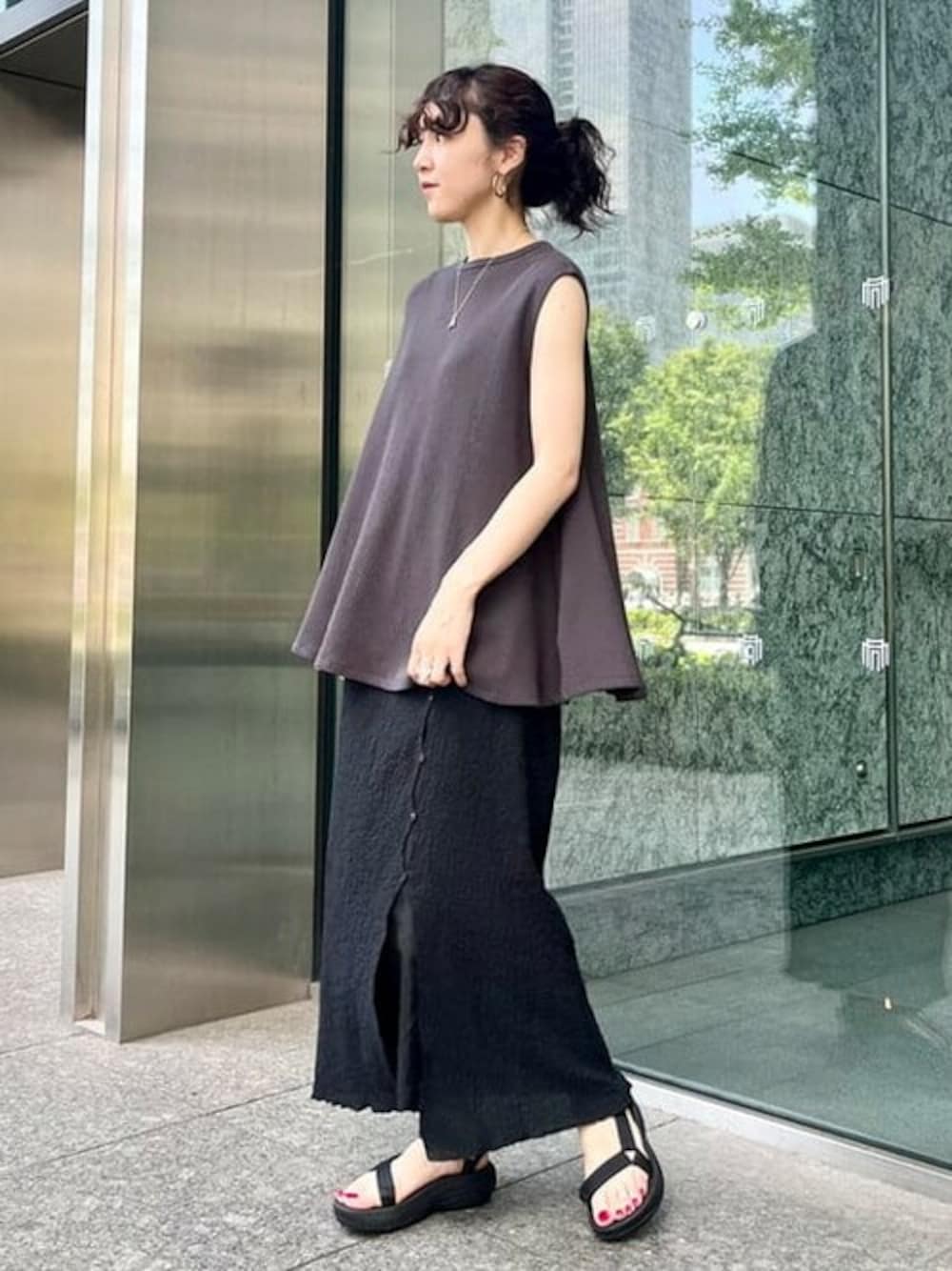 《素材やデザインで涼しげに》色が暗い色同士の合わせでも、ノースリーブや軽やかな素材ですと、夏でも涼しげですよ〜!!トップスもひらっとフレアに広がって夏でも快適に着ていただけるのがおすすめなポイントです!!〜【♡+】ボタンでお気に入り登録お願いします〜 ビームス 新丸の内 / kigo