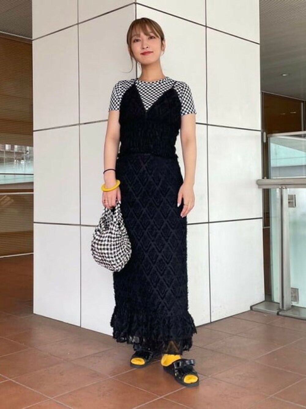 【ワンピースに見えるセットアップ】同じ柄のビスチェと、ワンピース♡合わせて着るとワンピースのようになります!チェッカー柄や、黄色を差し色にしてみました! ビームス 二子玉川 / 松本 佳菜子