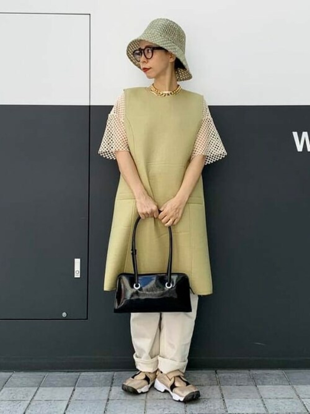 ミニワンピースにパンツスタイルで合わせました。カラーをワントーンにして、艶感のあるエナメルバッグをポイントにしました。ワンピースはハイソックスにミュールサンダルなんて合わせもオススメしたいです! ビームス 広島 / 上山
