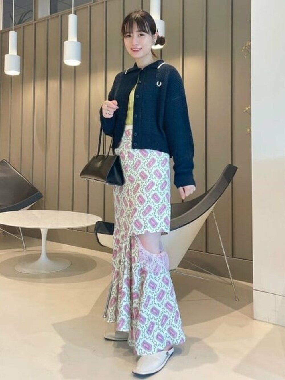 【お気に入り】の古着屋さんで購入したスカート。何がかわいいって大胆なのに下品な感じのしないスリット♡見てお分かりのように超ロングスカートなので丸いフォルムのカーディガンと合わせバランスを取りました◎カーディガンから覗かせたグリーンのトップスもスカートのプリントからカラーを拾いました♪ ビームス ウィメン 原宿 / 菅野梓
