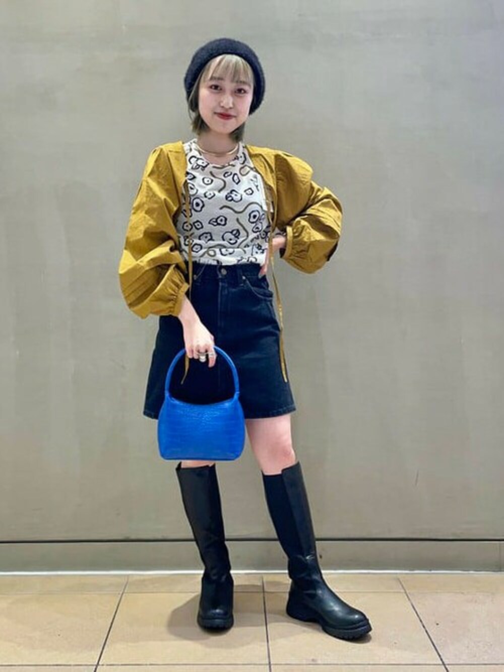 【今年のキーカラーはブルー!】ブルーのミニbagが映えてますね〜❤︎ ちょっぴりロックテイストでコーディネートを組みました!スカートはXSサイズ、ブーツは23cm、他はFREEサイズです!《♡+お気に入りで保存して後からすぐ見返せます!》 ビームス 天王寺 / カラツ ミナ