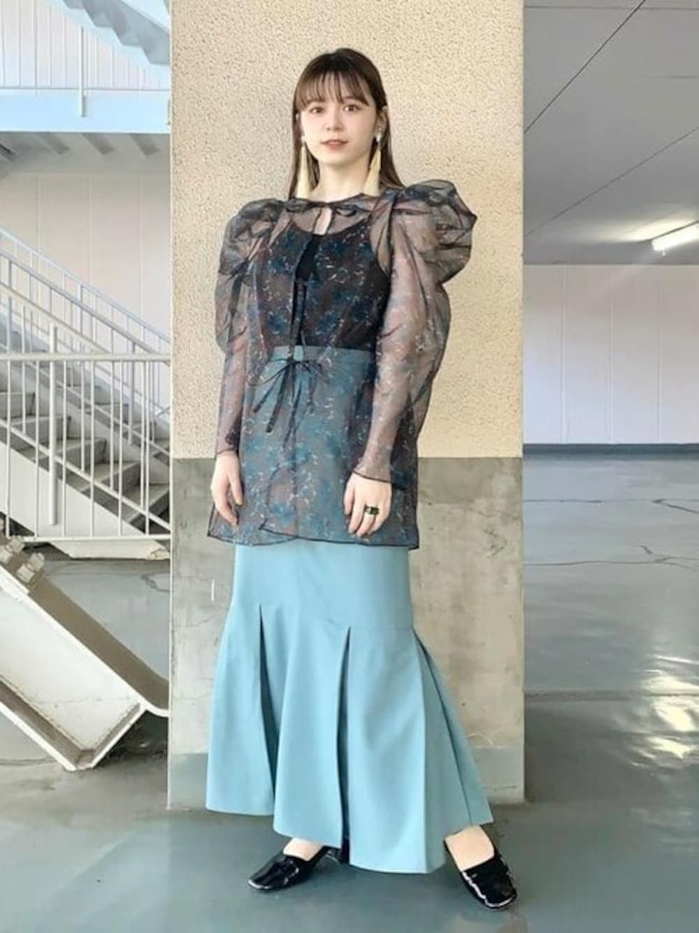 今年も<FUMIE=TANAKA × Ray BEAMS>のスペシャルアイテムが登場です!私のおすすめは、肩のボリュームが可愛い花柄のシアーシャツ♡今時期は華奢なキャミソールなどと合わせて肌見せするのもいいですし、秋冬はニットなど厚手の物も充分合わせられるサイズ感なので、いろんな着こなしが楽しめます♡ またイヤリングも<FUMIE=TANAKA × Ray BEAMS>の別注アイテム。肩にかかる長さのフリンジがとっても可愛いです。 ボトムスは、シャツの柄の色に合わせて、ブルーのマーメイドスカートにしました♡ ビームス 柏 / 田中 里実