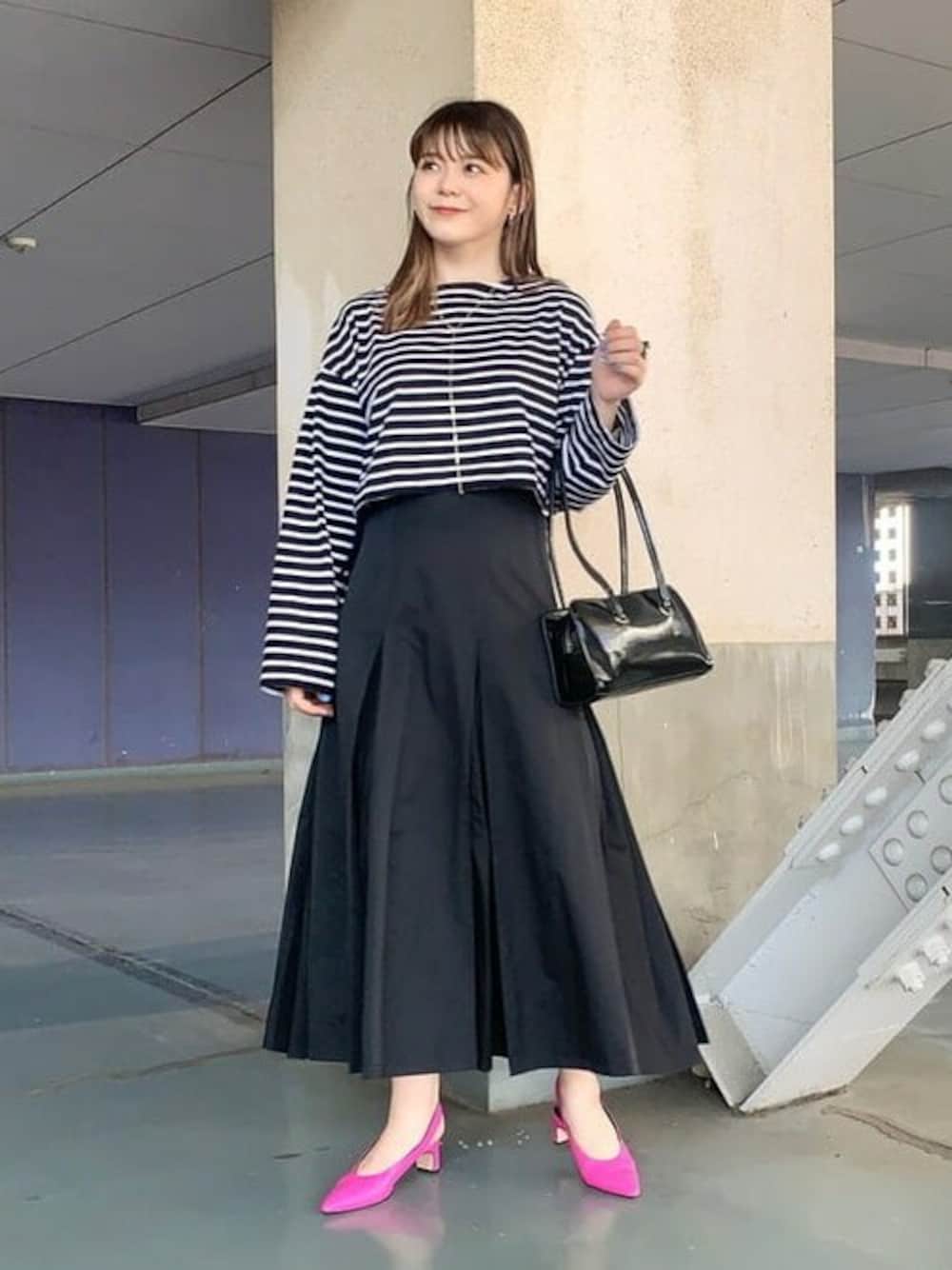 【おしゃれは足元から♡】本日は、ピンクのシューズを目立たせるべく、お洋服をブラックで合わせました!トップスは、今期一推しのスーパークロップド丈!短めの丈で脚長効果も狙えます!そのため、スカートはハイウエストで履けるものに。Aラインに広がり、プリーツ部分もちらっと見えるのが可愛いです♡ ビームス 柏 / 田中 里実