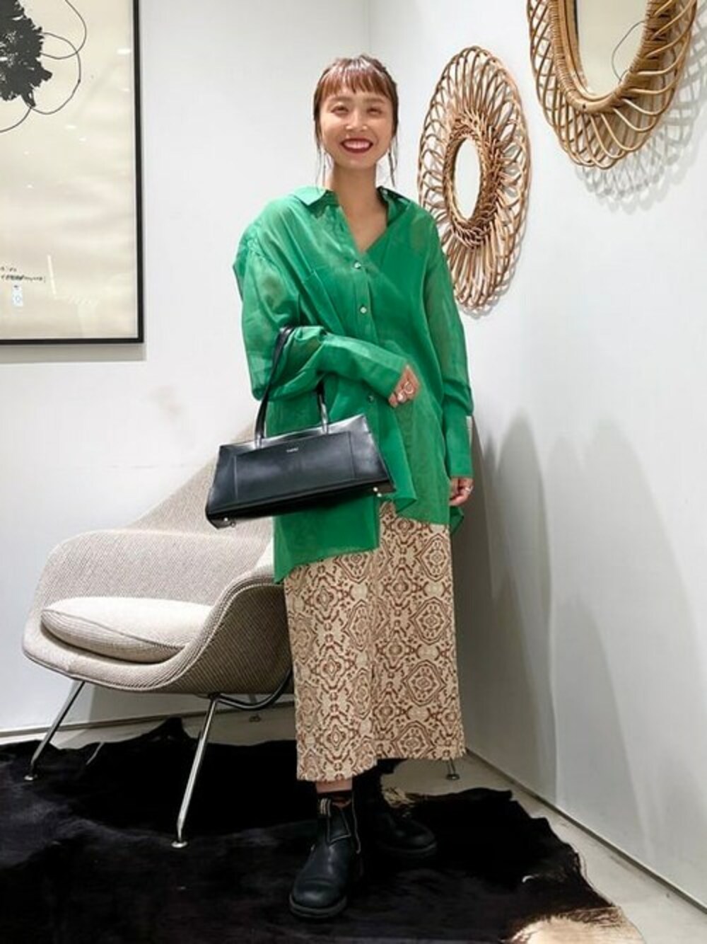 ●152センチ!小柄な方にもおすすめスタイリング● 綺麗なグリーンが目を惹く、す〜けすけシャツは、オーバーサイズなので、わざとボタンをずらしてかけることで動きが出て、低身長な私でもスッキリと着ることが出来ました!ト横長スクエアバッグで、一気にトレンド感がアップ♪ 前スリットスカートはスタイルアップ&動きやすさもgood! 【下の♡+お気に入りボタンを押して頂くと、後ほど見返すときに便利です〜!フォローも宜しくお願い致します♪】 ビームス 六本木ヒルズ / 林 綾乃