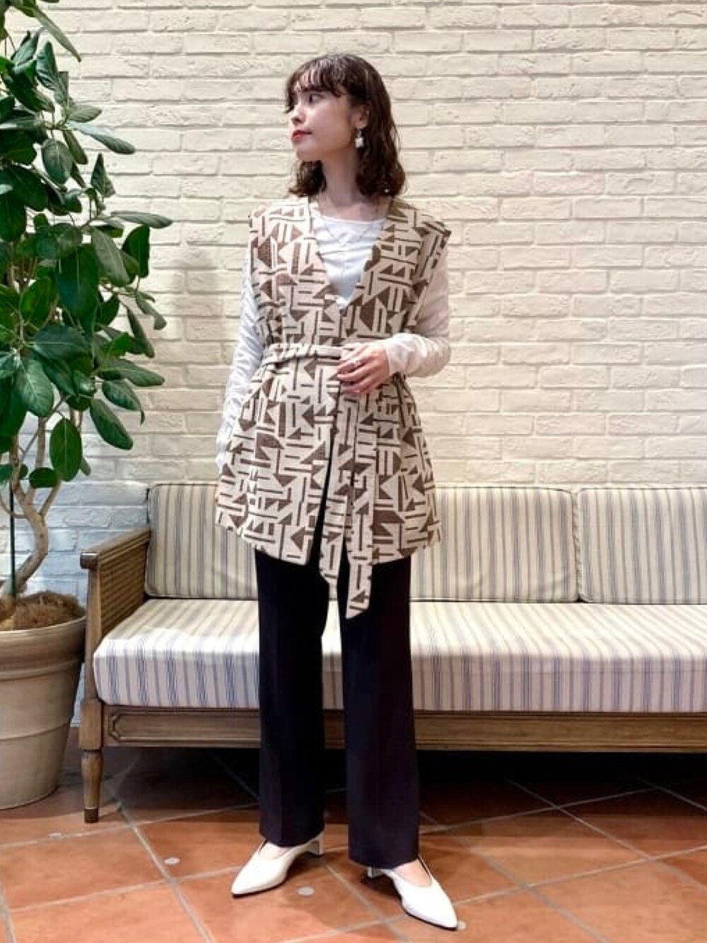 ブラウンとホワイトでまとめてみました。 <RBS>のジオメトリック柄ベストは、腰まで隠れる長さがバランス取りやすいです!ベルトで自由にアレンジできます。 <REMME>のミュールは柔らかくて履きやすいのでおすすめです〜! ビームス 吉祥寺 / 奥浜 春花