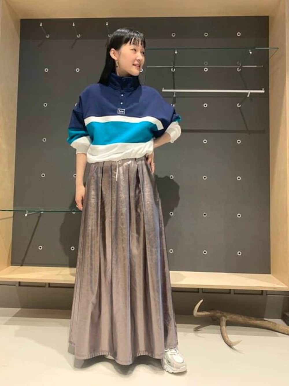 【22AW予約アイテム】どこか懐かしさのある配色の<Lee>のスウェット。スポーティになりすぎないように、メタリックのスカートを合わせました。高身長を生かし、スウェットはブラウジングして短めに、スカートはマキシ丈で脚長効果を◎ Ray BEAMS / hazuki