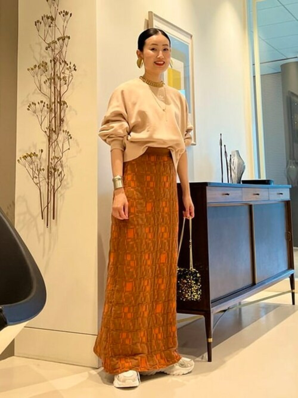 WEB限定の〈adidas〉スウェットと、〈FILA〉スニーカーだとスポーツテイストが強くなるので、ゴールドジュエリーや〈Kassiopea〉スパンコールバッグを加えて華やかさも添えてみました。 ビームス 丸の内 / たて ふくみ