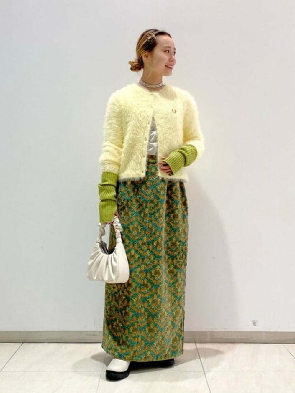 【FRED PERRY × Ray BEAMS】短丈のカーディガンにロングのスカートを合わせてバランス良く。色味も秋っぽく統一感を持たせて、バッグはブーツと白で合わせました。寒くなる準備は万端です、早く秋来て、、、! ビームス 鹿児島 /