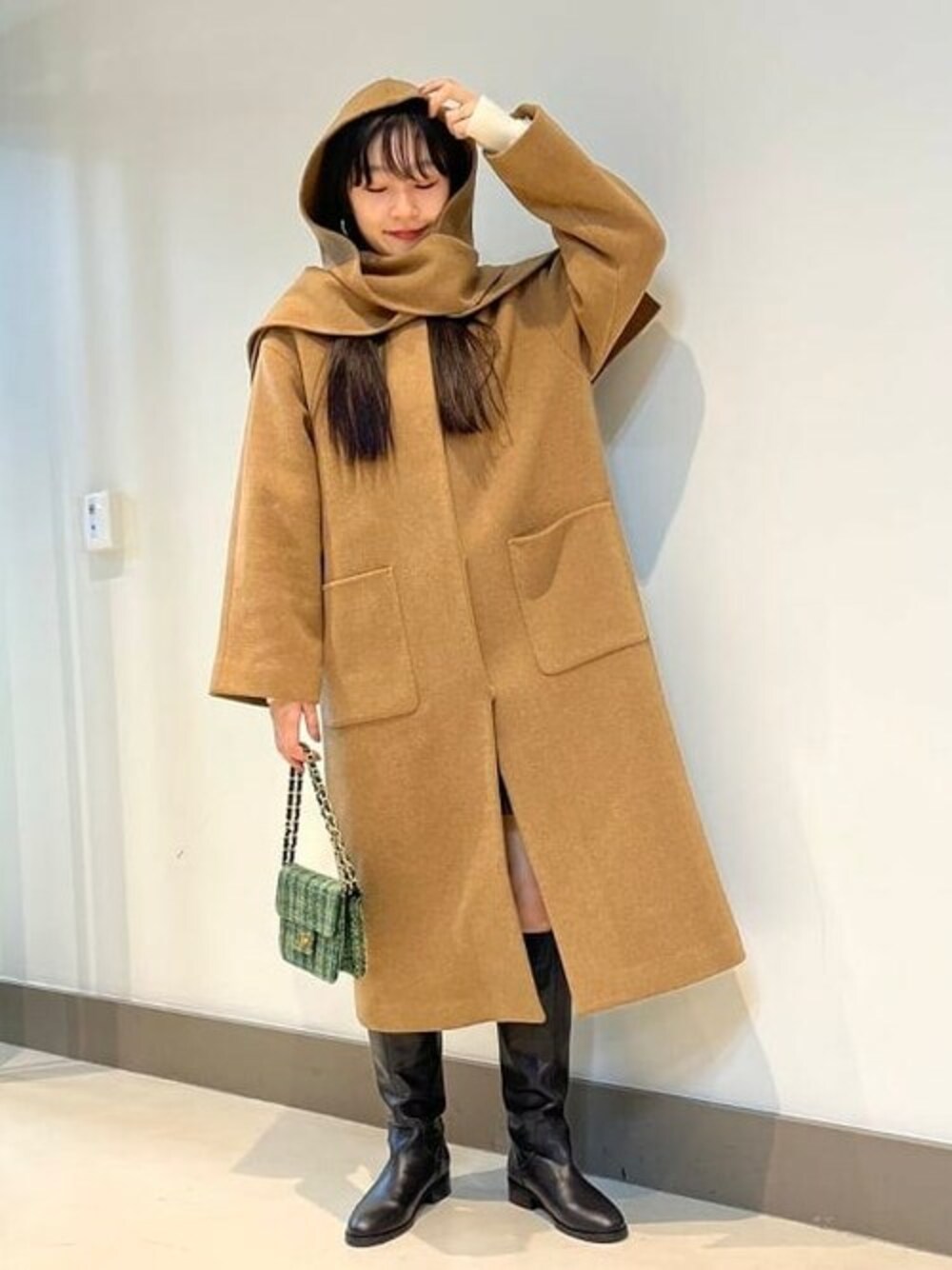 【いろんな着方が叶うコート】今季注目のフードデザイン。コートにマフラーフード付きなんです。しかも取り外し可能!綺麗見えするのでミニバッグで上品にスタイリングしました。取り外したときのノーカラーコートもかわいいですよ! Ray BEAMS / hazuki