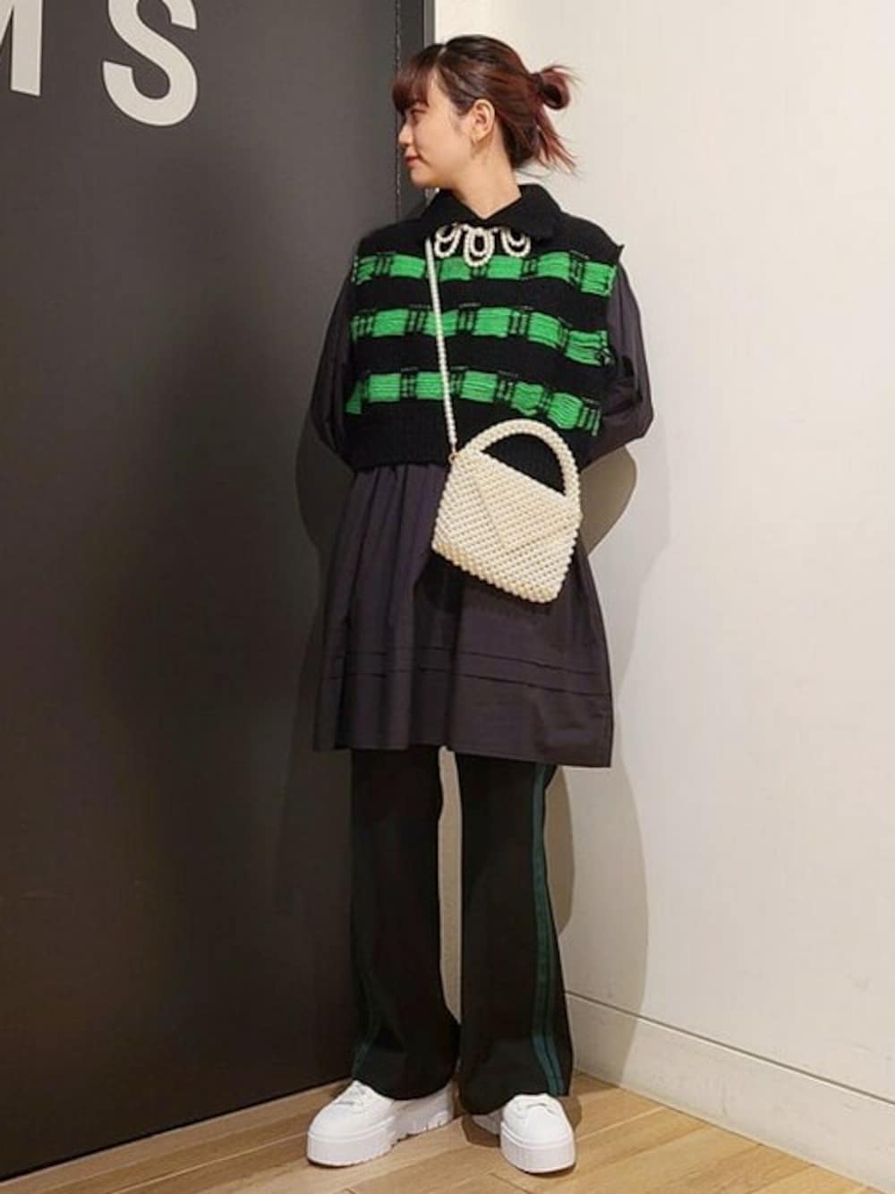 寒くなってきたので<Yuumi ARIA>のニットをレイヤードしてしてみました。こちらあえて裏地の編みを表面にしてデザインしているんです!ウール100%で暖かく、モノトーンスタイルのアクセントにとてもオススメ。全体的にブラックで重いので、小物はビーズをチョイスしました。<PUMA>×Ray BEAMSのスニーカーはソールの重さがとても可愛い!横幅があるので、幅広の方も普段サイズで選んで頂いて大丈夫です◎