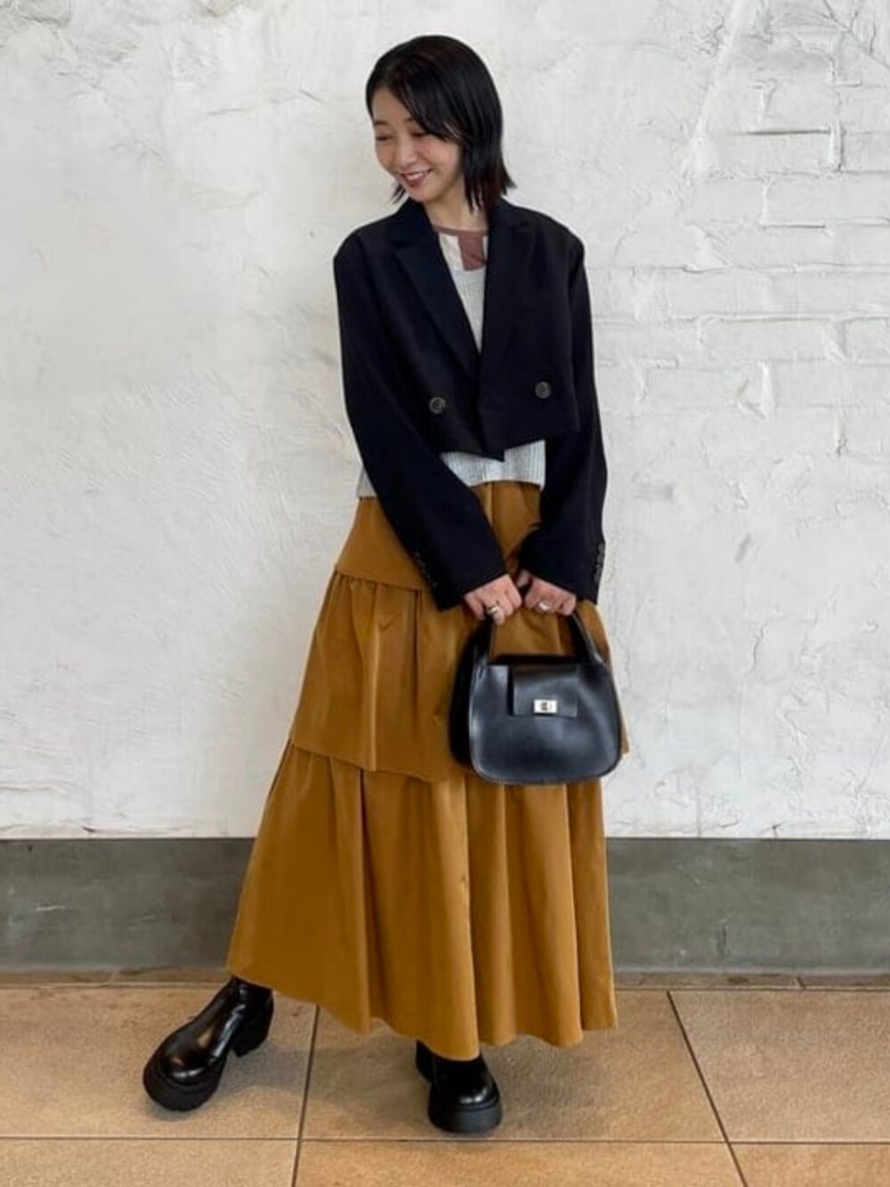 【トレンドクロップド丈】今期のトレンドでスタイルアップも叶うクロップド丈のジャケットに、ボリューム感のあるティアードスカートを合わせました。クロップド丈にロングスカートの組み合わせがとても可愛のでおすすめです! ビームス 千葉 / miya
